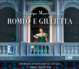 Filippo Marchetti (1831-1902) : Romeo e Giulietta. Mario Cassi, Cappellio ; Serena Daolio, Giulietta ; Giovanni Coletta, Tebaldo ; Dario Solari, Paride ; Roberto Iuliano, Romeo ; Emil Zhelev, Frate Lorenzo ; Andrea Mastroni, Baldassare ; Tiziana Portoghese, Marta. Orchestre International d’Italie & Chœur de Chambre de Bratislava, direction : Andriy Yurkevych. 2 CD Dynamic CDS 502. Enregistré live au festival de Martina Franca, août 2005. Notice en italien, anglais, allemand et français. Durée : 137’19.