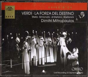 Giuseppe Verdi (1813-1901) : La Forza del destino. Ludwig Welter, Il Marchese di Calatrava ; Antonietta Stella, Donna Leonora ; Ettore Bastianini, Don carlo di Vargas ; Giuseppe di Stefano, Alvaro ; Guilietta Simionato, Preziosilla ; Walter Kreppel, Padre Guardiano ; Karl Dönch, Fra Melitone ; Annemarie Ludwig, Curra ; Harald Pröglhöf, Un Alcade ; Hugo Meyer-Welfing, Mastro Trabuco ; Franz Bierbach, Un Chirurgo. Chœur et orchestre du Wiener Staatsoper, direction : Dimitri Mitropoulos. 2 CD Orfeo C 681 0621. Enregistré au Staatsoper de Vienne lors de la représentation du 23 septembre 1960. ADD Stéréo. Notice de présentation en allemand, anglais et français. Texte chanté en italien. Durée : 151’19’’.
