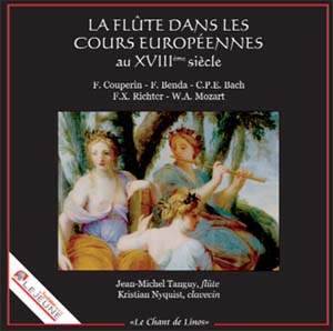 François Couperin (1668-1733) : 4ème Concert royal. Frantisek Benda (1709-1786) : Sonate en mi mineur. Carl Philipp Emanuel Bach (1714-1788) : Sonate en sol majeur. Franz Xaver Richter (1709-1789) : Sonate en sol majeur. Wolfgang Amadeus Mozart (1756-1791) : Sonate en sol majeur K301. Jean-Michel Tanguy, flûte, Kristian Nyquist, clavecin. 1 CD Le Chant de Linos CL 0408. Notice bilingue (français, anglais). Durée : 65’19’’.