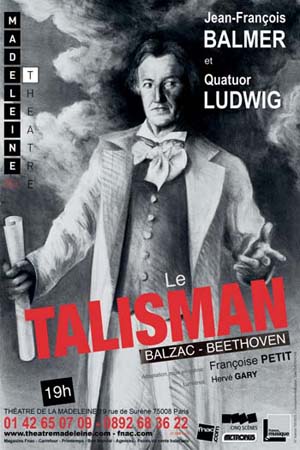 « Deux des plus grands héros de la littérature et de la musique, deux œuvres monumentales, deux destins passionnants où Vie et Art se confondent, deux volontés proprement héroïques, deux raisons de vivre vers un objectif unique : la création artistique ». Ainsi se présente ce spectacle musical, entre théâtre, littérature et musique de chambre. Le Talisman est la seconde collaboration du metteur en scène Françoise Petit et de l'acteur Jean-François Balmer : après Journaux Intimes ou Baudelaire dit par Balmer, Françoise Petit tente le tour de force d'unir en une même représentation des textes issus de La Comédie Humaine, chef d'œuvre d'Honoré de Balzac, avec des extraits des Quatuors à cordes de Beethoven.