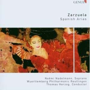 Ruperto Chapi (1851-1909) : Carceleras (Las hijas del Zebedeo) ; Canción de Pastora : « Te quiero » et Preludio (La Patria chica). Pablo Luna (1879-1942) : Canción española : « De España vengo » (El Niño judio) ; Intermedio (La Picara molinera). Gerónimo Giménez (1852-1923) : Romanza de la Tempranica : « Sierras de Granada » (La Tempranica) ; Preludio (La Torre del oro) ; Manuel Fernández-Caballero (1835-1906) : Romanza de Angelita (Château Margaux) ; Balada y alborada : « Noche pura y serena » (El Señor Joaquim) ; Francisco Asenjo Barbieri (1823-1894) : Canción de Paloma : « Como nací en la calle de la Paloma » (El Barberillo de Lavapiés) ; Jesús Guridi (1886-1961) : Melodia de las flores : « Goizeko eguzki argiak » (Mirentxu) ; Gerónimo Giménez / Manuel Nieto (1844-1915) : « Me Ilaman la primarosa » (El Barbero de Sevilla). Noëmi Nadelmann, soprano. Württembergische Philharmonie Reutlingen, direction : Thomas Herzog. 1 CD Genuin. Réf. : GEN 86071. Enregistré au Studio de la Wuerttemberg Philharmonie Reutlingen, les 19-20 mai 2006. DDD. Notice : bilingue (anglais-allemand). Durée : 63’30
