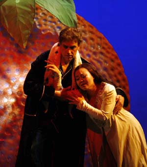 En effet, la production de L'Amour des Trois Oranges de Martin Duncan, montrée pour la première fois en 2001, compte parmi les spectacles les plus réussis de l'Opéra de Cologne de ces derniers temps. C'est un spectacle moderne au meilleur sens du terme, plein d'humour, de couleurs et d'idées où l'on ne s'ennuie pas un seul moment, où l'on n'a jamais l'impression d'assister à un défilé de gags superflus qui pourraient détourner l'attention de la musique. Au contraire, mise en scène, décors et costumes sont à tout moment en phase avec la musique vivante et drôle de Prokofiev. Un plaisir pas très courant dans la patrie du Regietheater.