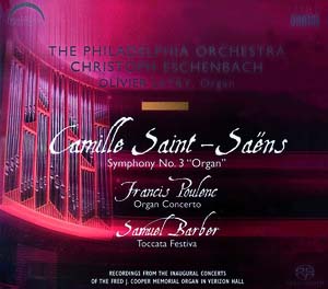 Le nouveau disque de Christoph Eschenbach et de son Orchestre de Philadelphie est le reflet du concert donné pour l'inauguration du grand orgue Fred. J. Cooper du Verizon Hall, la nouvelle salle de résidence de cet ensemble. Il s'agit du plus grand orgue de concert construit sur le sol américain. Le présent disque s'ouvre par la Toccata Festiva de Samuel Barber. Fortement lié à Philadelphie où il étudia et enseigna au célèbre Curtis Institute, le compositeur écrivit sa Toccata Festiva pour marquer la construction du gigantesque orgue Aeolian-Skinner de la salle de L'Academy of Music, ancienne salle de concert de l'orchestre. Créée en 1960, cette pièce est du pur Barber : une musique puissamment charpentée, alliée à une totale maîtrise de l'orchestration. Olivier Latry et Christoph Eschenbach en donnent une lecture énergique et jubilatoire. Le Concerto pour orgue de Poulenc témoigne du talent de l'organiste qui rend toutes les facettes de cette partition mystique mais rayonnante. L'orchestre le suit avec souplesse et attention, mais on aimerait un peu plus de légèreté et de finesse dans cet accompagnement plus fonctionnel qu'inspiré.