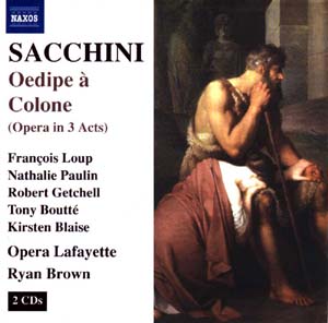 Disons-le tout net : admiré de Berlioz, qui avait la dent dure, Œdipe à Colone est un authentique chef-d'œuvre de la tragédie lyrique, et même de l'opéra classique ; c'est dire l'importance de cette parution. On y retrouve certes le ton noble de la déclamation tragique, mais sans emphase car transcendé par une verve mélodique tout italienne. La pompe des longs récitatifs est ainsi habillée d'une orchestration toujours vivante et dynamique, d'une écriture bien plus complexe et fine que celle de Gluck. Surtout, Sacchini apporte dans cette forme alors moribonde des structures plus ouvertes, une harmonie volontiers épicée de dissonances expressives, un goût certain pour la modulation brusque et dramatique. Bref, une vie et un sens théâtral fort novateurs qui échappent aux conventions. L'intérêt est toujours soutenu et certains airs sont même d'une très grande beauté. On a plus d'une fois l'étrange sentiment d'écouter un Mozart qui se serait plié, et de bonne grâce, aux exigences de ces « imbéciles de Français ».