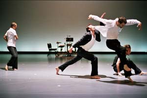 La troisième partie de la soirée est introduite par un solo féminin qui laisse la place au Poème symphonique pour cent métronomes de Ligeti. Remontés comme les lapins Duracel ®, ces métronomes rouges placés à l'avant-scène font un bruit doux de pluie que l'on écoutera jusqu'au dernier battement. Place alors à la première partie de Drumming, une pièce en clair-obscur de 1997, emblématique de la dernière période créative de la chorégraphe, où la maîtrise de son écriture déliée, moderne et musicale se conjugue aussi bien au féminin qu'au masculin. Les accents tribaux de la musique sont mâtinés d'une extrême sophistication gestuelle. Technicité parfaite, interprétation irréprochable, autour d'un couple, puis d'un quatuor central entouré de l'ensemble des interprètes. Depuis les créations les plus marquantes de la fin des années 1980 autour de Bach ou de Mozart, cette pièce que l'on a grand plaisir à revoir est sans conteste le chef d'œuvre à ce jour de la chorégraphe. Une très grande soirée !