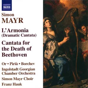 Simon Mayr (1763-1845) : L’Armonia – Azione drammatica ; Cantata sopra la morte di Beethoven. Talia Or, soprano ; Altin Piriù, ténor ; Nikolay Borchev, basse. Simon Mayr Choir, Ingolstadt Gerogian Chamber Orchestra, direction : Franz Hauk. 1 CD Naxos 8. 557958. Enregistré en septembre 2005. Notice bilingue en anglais et allemand, pas de livret. Durée : 59’30’’
