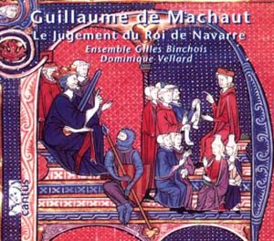 Guillaume de Machaut (ca. 1300-1377) : Le jugement du Roi de Navarre, Ballades, motets, virelais et textes récités. Ensemble Gilles Binchois : Anne-Marie Lablaude, chant ; Brigitte Lesne, chant, harpe, percussions ; Akira Tachikawa, chant ; Dominique Vellard, chant, guiterne ; Emmanuel Bonnardot, chant, vièle, rebec ; Pierre Hamon, flûtes à bec, traversaine, cornemuse ; Randall Cook, vièle, flûte à bec ; Jean-Paul Racodon, récitant. Direction : Dominique Vellard. 1 CD Cantus C 9626. Enregistrement en l’église de Grancey-le-Château en octobre 1994. Notice multilingue (espagnol, français, anglais, allemand) très soignée et complète avec la totalité des textes chantés traduits dans ces quatre langues (106 pages !). Durée : 65’25’’