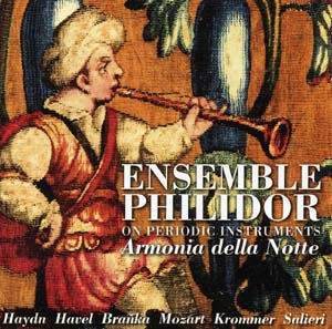 Joseph Haydn (1732-1809) : Parthie in B. Václav Havel (ca 1778-après1826) : La Pastorella allegretto. František Braňka (fin du XVIIIe siècle) : Cassatio in B. Wofgang Amadeus Mozart (1756-1791) : Parthia 18. Wofgang Amadeus Mozart/Gotttfried Rieger (1764-1855) : Marcia de La Clemenza di Tito. František Kramář-Krommer (1759-1831) : Partita in C minor. Ensemble Philidor : Antonio Salieri (1750-1825) : Armonia per un Tempio della Notte. François Gillardot, Monica Arpino, clarinette ; Florent Maupetit, cor d’harmonie ; Ermès Pecchinini, cor d’harmonie et tuba pastoral ; François Charruyer, Alexandre Salles, basson. Direction : Eric Baude. 1 CD ArcoDiva UP 0096 – 2 131 DDD FP. Code barre : 8 594029 9 10969. Enregistré en Moravie à la Bibliothèque du château de Námĕšť du 20 au 22 septembre 2006. Notice trilingue (tchèque, anglais, français). Durée totale : 65’59’’