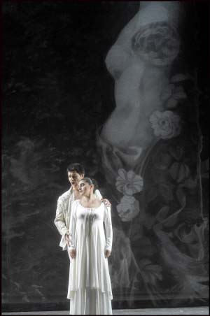 Autre artiste bien connu en ces murs, où il est également en résidence : le metteur en scène . D'un tel artiste on attend beaucoup, et s'il n'emporte pas toujours immédiatement l'adhésion, ses travaux frappent et laissent difficilement indifférent. Sa Carmen surprenait ; sa vision de Jeanne d'Arc au bûcher, anthologique, était d'une beauté et d'une vérité hallucinantes. Lui aussi se frotte au génie mozartien, avec Don Giovanni puis Die Zauberflöte. Sa vision du mythe intemporel de Tirso de Molina est sobre et efficace. Les décors utilisent de nombreux panneaux coulissants qui viennent cloisonner les lieux du drame pour plus de vraisemblance, lorsque deux personnages en scène ne se voient pas, tandis que leur transparence relative nous permet de les voir. A cela s'ajoutent des jeux savants de lumières et d'ombres et ainsi s'établissent différents tableaux particulièrement réussis comme l'enterrement du Commandeur, ou l'apparition fugace et transparente d'un personnage féminin, lorsque le séducteur chante son vice (Deh, vieni alla finestra) ; ou encore le passage où l'on attendait le savoir-faire de l'homme de théâtre : la scène du festin. La déchéance du héros est figurée par le dépouillement progressif de la scène : le mobilier se délite, le grand lustre choit et la pénombre fait place à une lumière omniprésente, sur fond ouvert, les nuages. La vraisemblance – pour peu qu'on puisse la faire apparaître dans cet opéra – est soignée. Les couleurs dominantes sombres, gris, gris bleuté, les costumes d'inspiration XVIIIe, tout concourt à une vraie réussite théâtrale.