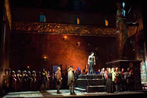 Après le vide noir conçu par Yannis Kokkos à Nancy et Caen en 2005, la maison de retraite imaginée par Krzysztof Warlikowski à Garnier en 2006 et la boite noire (encore !) de Robert Carsen à Londres et San Francisco en 2007, Stephen Wadsworth à Seattle remet Iphigénie la grande prêtresse dans le temple de Diane, son temple, tout simplement. Un décor unique séparé en trois parties inégales, le temple aux teintes rouges et or prenant l'essentiel de l'espace, un étroit corridor figurant la prison aux teintes froides, un plus étroit passage sur l'extrême gauche de la scène représentant l'extérieur du temple.