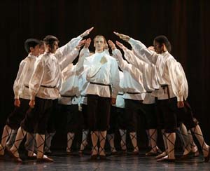 Nancy. Opéra National de Lorraine. 14-XII-2007. Igor Stravinsky (1882-1971) : Noces, scènes chorégraphiques russes avec chant et musique. Livret du compositeur. Version orchestrale de 1917 et version définitive de 1923. Chorégraphie : Bronislava Nijinska, réglée par Aleth Francillon. Décors/Costumes : Natalia Gontcharova. Nouvelle création chorégraphique intitulée Mariage. Chorégraphie/Mise en scène : Tero Saarinen. Décors/Lumières : Mikki Kunttu. Costumes : Erika Turunen. Avec : Khatouna Gadelia, la Fiancée ; Avi Klemberg, le Fiancé ; Katalyn Varkonyi, la Mère ; Jean Teitgen, le Père ; Dania Di Nova, une Mère ; Fabien Leriche, basse solo, Natalia Golovchanskaya, Thierry Garin, Solange Fober, Vincent Royer, pianistes ; Marcel Artzer, timbales ; Richard Morellini, Yragael Unfer, Anne Midol Monnet, Laurence Brygo, Yannick Giuliani, percussions. Centre Chorégraphique National–Ballet de Lorraine, Chœur de l’Opéra national de Lorraine (chef de chœur : Merion Powell), Orchestre symphonique et lyrique de Nancy, direction : Jonathan Schiffman.