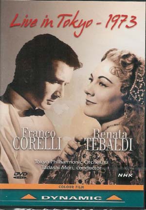 Franco Corelli et Renata Tebaldi live in Tokyo. Musique de Luigi Denza, Vincenzo Bellini, Christoph Willibald Gluck, Giuseppe Verdi, Jules Massenet, Giacomo Puccini, Edvard Grieg, Claudio Monteverdi, Gioacchino Rossini, Ernesto de Curtis, Francesco Paolo Tosti, Gaetano Donizetti et Salvatore Cardillo. Franco Corelli, ténor ; Renata Tebaldi, soprano. NN, piano ; Tokyo Philharminc Orchestra, direction : Tadashi Mori. 1 DVD Dynamic 33542, code barre 8 007144 335427. Enregistré au NHK Hall, Tokyo, le 21 novembre 1973. NTSC, Zone 0. Notice en italien, anglais allemand et français. Durée : 89 minutes.