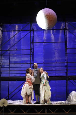 s'empare de cette comédie onirique sans artifices mais avec habileté et humour, faisant surgir d'un cadre épuré de belles images poétiques et dirigeant avec soin une sympathique troupe de jeunes chanteurs. Pour souligner la permanence et la subtilité de caractères finement croqués, et favoriser l'empathie entre le spectateur et les acteurs, le metteur en scène a choisi une approche au second degré : pendant l'ouverture, les chanteurs font leur apparition sur scène en tenue contemporaine et se déguisent à vue « pour nous raconter l'histoire dont ils vont être les protagonistes ». Le dispositif scénique, à la fois sobre et imaginatif, souligne par ses tréteaux la thématique du théâtre dans le théâtre. Décors, costumes et lumières concourent à dessiner un Monde de la Lune malicieux et magique. La présence de deux comédiens danseurs (Vincent Coppin et Samuel Vittoz), impliqués dans des tableaux comiques et figurant les serviteurs d'Ecclitico, participe également à la fluidité d'un spectacle joyeux et coloré, qui rend pleinement justice à la finesse de l'ouvrage comme à son côté bouffe.