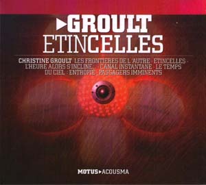 Christine Groult (née en ?), Étincelles  : Les Frontières de l’autre, Étincelles, L’Heure alors s’incline…, Canal instantané, Le Temps du ciel : Entropie, Passagers imminents. 1 CD Motus M306012, code barre : 3566123060125. Notice de 4 pages en français et en anglais. Durée : 76’25’’.