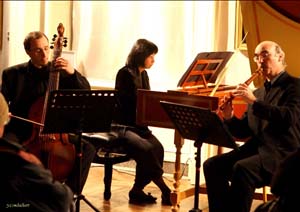 Jean Marc Andrieu blessé à épaule ne laissera rien paraître de sa douleur dans les jeux raffinés, qu'il offre avec ses deux flûtes à bec, ce soir la classique flûte en do mais aussi une flûte de voix en ré. Mais il n'est pas seulement un merveilleux soliste, il est surtout un partenaire attentif et un chercheur infatigable qui sait proposer un concert fascinant avec des œuvres rares et qui méritent d'être connues. Œuvres pour la plupart intimistes et émouvantes mais aussi brillantes. La souplesse et la précision du jeu de Yasuko Uyama-Bouvard fait une grande impression dans le couple de sonates de Scarlatti. La technique est prodigieuse mais surtout c'est la délicatesse du toucher, les couleurs de son jeu qui sont rares au clavecin. Lorsqu'elle s'empare du grand clavecin français pour le prélude de Couperin elle semble nous ouvrir un autre monde, avec un autre touché et des couleurs nouvelles. Etienne Mangot nous ravit en nous offrant un voyage rempli d'émotion et de mélancolie avec l'écho du Danube de Johannes Schenck. Là aussi, la technique formidable se met au service d'une musicalité raffinée d'ou naît une belle émotion. Merci à ces trois superbes musiciens de s'accorder sur cette grande qualité : aimer la musique, aimer la faire ensemble et savoir l'offrir au public. En bis, la chacone en trio de Jaques Morel a fait merveille.