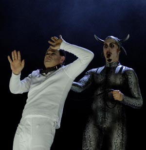 Les mirages de l'argent facile, la spéculation, l'évacuation du mal-être dans la dérive alcoolique, la corruption des âmes, tout y est ! Carlos Wagner en est conscient et réfute l'anecdote ou même le moindre repère local ou temporel, pour peindre la déchéance d'une âme simple confrontée à une société corruptrice agissant comme un rouleau compresseur, une machine à briser les volontés dont Rakewell ne s'évadera que par la folie. Les chœurs, habillés en traders de la City, avec portables et attachés cases, le démontrent : c'est notre société prétendument libérale mais essentiellement capitaliste qui est la cible. Tous les vices de notre époque participent à l'anéantissement de l'individualiste voltairien qu'est Tom : le culte de l'argent pour l'argent, l'amour tarifé, l'illusion de l'oubli dans les pires addictions. Déprimant tableau ? Non, bien heureusement, car Carlos Wagner apporte toute sa créativité à l'ouvrage dès la scène d'ouverture où un Tom photographe se met en scène au côté d'Anne dans des poses fantaisistes. Le metteur en scène multiplie clins d'œil malicieux, tours de passe-passe et traits d'humour, dans une vision roborative de l'ouvrage. Seul le tableau de l'asile le trouve à cours d'imagination ; il s'en remet alors aux seules qualités vocales de ses interprètes. Le dispositif scénique dépouillé s'articule autour d'un plateau tournant qui exprime tous les vertiges, mais l'essentiel repose sur une direction d'acteurs précise et inventive.
