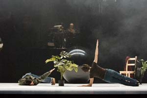 A l'étrangeté des corps et de la musique répond celle de la scénographie. Dans une lumière sépulcrale réalisée au moyen d'un vaste rectangle blanc rétro-éclairé, de lisses sphères noires traversent lentement la scène de temps à autre, en toute autonomie. On est du côté obscur de la force, une force tellurique où l'humain est impuissant. Ajoutant à l'incongruité de la scène, la voix d'outre-tombe du chorégraphe Mark Tompkins lit en anglais des extraits d'» Asphodèle », texte d'un précurseur de la beat generation, qu'il ponctue de chansons puisées dans le répertoire pop-rock anglo-saxon. Au fur et à mesure que la scène se vide de ses accessoires et se remplit de sphères, on assiste à la vision très « bob wilsonnienne » d'un Tompkins seul sur une chaise, parlant, criant puis vociférant dans une brume de plus en plus épaisse et tenace où l'on distingue parfois un amas de corps.