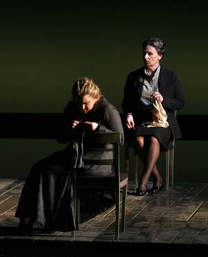 Quelle heureuse idée en effet que d'importer la sublime mise en scène de Robert Carsen conçue originairement pour le Vlaamse Opera d'Anvers et mélangeant habilement réalisme et symbolisme, moments étouffants et moments de pure poésie, et tout cela sans jamais trahir ni texte, ni musique. L'élément central de cette production est l'eau qui recouvre quasiment toute la scène : la Volga du livret, reflet des sentiments humains, et lieu, tour à tour, de liberté, d'amour et de la mort. A ce symbolisme de base répondent comme éléments réalistes de beaux costumes année 1920, quelques passerelles en bois, quatre chaises et quelques valises. S'ajoutent une direction d'acteur à la fois naturelle et fouillée ainsi qu'un jeu de lumières d'une rare beauté.