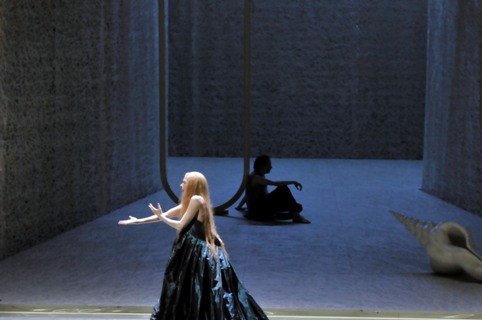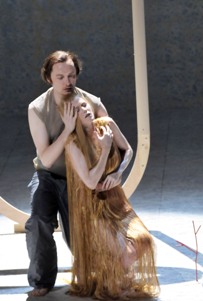 La mise en scène – on devrait plutôt parler de mise en espace devant l'absence d'action – de Giuseppe Frigeni reste dans le symbole. Peu d'effets, tout est dans le geste, l'intention. Une rigole emplie d'eau coupe la scène en deux dans le sens de la largeur, comme une frontière immatérielle entre deux mondes. La scène est délimitée par de vastes pans de mur recouverts d'une végétation blanche et stylisée. Un coquillage, simple élément scénique (ou bien symbole de la féminité ?) meuble la coté gauche. A droite, un diapason géant muni d'un disque coulissant entre ses branches représente tout à la fois la musique, élément fondamental du mythe d'Orphée, le soleil et un œil observateur d'une puissance supérieure qui au final fait et défait les passions. Point de vue interprètes, on frôle la perfection. et (souvent sollicité en voix de fausset) forment un couple d'amants déchirés on ne peut plus crédible. Pour les six Gli altri, l'idée de faire appel à un groupe constitué (l'excellent ensemble ) plutôt qu'à six solistes permet d'avoir une cohérence de jeu comme de sonorité. Dans la fosse l' est le vecteur idéal pour rendre justice à l'orchestration si fine de , surtout sous la direction ferme et attentive de .