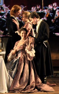 À chaque fois qu'une personnalité de la caméra s'attaque à une œuvre lyrique, celle-ci est-elle à ce point saisie par la musique qu'elle livre un travail extrêmement soigné et scrupuleusement respectueux ? Fanny Ardant (Véronique) et David Cronenberg (The fly) cette saison, Josée Dayan et Jeanne Moreau les années passées ont donné des lectures très sages et presque artisanales. Seule réelle originalité : des images projetées en fond de scène, tournées en bord de mer, au sud d'Aix-en-Provence, entre Cassis et La Ciotat, comme autant de panoramas vus depuis la maison Fiordiligi et Dorabella. Les décors de Chloé Obolensky confirment cette Méditerranée occidentale où pourrait se passer l'action. Ce Così fan tutte aixois millésime 2008 ne fait pas exception : de la belle ouvrage, des acteurs bien dirigés et un spectacle inscrit dans une tradition toute mozartienne de légèreté et de bon goût.