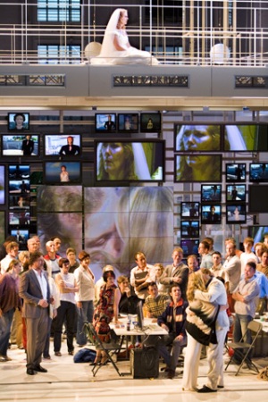 L'acte I voit heureusement ces volets s'élever pour dévoiler le reste du plateau. On y observe un mur d'écrans composé à la manière d'une toile de Mondrian, ainsi qu'un ensemble de passerelles surplombant la scène. Le mur vidéo est ici conçu comme un miroir reflétant les ambitions des Gibichungen, Celles-ci sont révélées à travers des images extraites du jeu vidéo «second life» proposant une immersion dans un univers factice, outrancièrement «bling bling» et offrant à tout un chacun la possibilité de goûter à une douce illusion de pouvoir omnipotent. Cette idée du metteur en scène fonctionne assez bien, développant de multiples niveaux de lectures, selon que le spectateur se concentrera sur le jeu des chanteurs ou sur les écrans vidéos. L'acte II est le plus réussi du spectacle, dominé par la prestation du chœur d'hommes de la maison. Van Hove y démontre une nouvelle fois sa capacité à diriger les foules pour créer des tableaux à l'esthétique forte. Les filles du Rhin, costumées en soubrettes préparant le mariage de Siegfried et Brünnhilde laisseront davantage le spectateur perplexe au début de l'acte III… La mise en scène peine alors à restituer le contenu du livret et les vidéos apparaissent également redondantes. Le cycle se clôturera néanmoins sur une image très cohérente : le contenu technologique présenté sur l'ensemble du festival se voyant balayé par les éléments naturels. Marqué par les images de l'ouragan Katrina qui illustrent abondamment le programme du spectacle, Van Hove nous montre avant que le rideau ne se baisse une foule sinistrée mais sereine, libérée malgré elle de ses repères artificiels.