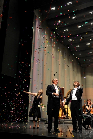 Natalie Dessay était bien en voix, l'homogénéité des registres semblant stable, le médium sonore et les suraigus toujours victorieux. Sa Traviata est attendue à Santa Fé en 2009 et même si c'est dans l'air Sempre libera qu'elle a obtenu son succès personnel le plus perceptible ce soir, en raison d'une implication inhabituelle dans les vocalises folles de la fin de l'air, les phrases sont courtes et c'est là que le danger guette. Danger d'une dernière prise de rôle qui pourrait être suicidaire… est-ce la joie d'entendre un air connu parfaitement interprété qui a motivé le succès ? Ou justement ce danger que le public a senti et aimé ?? Jonas Kaufmann a une voix très étrange, qui ne s'oublie pas. Il y a des raucités dans le grave et les aigus sont parfois engorgés et serrés. Les effets qu'il en tire forcent l'admiration. Et son phrasé, ses nuances, sa manière d'utiliser la voix de tête, tout cela reste toujours très musical. Ses efforts vers une diction claire sont louables y compris en français. Mais le timbre n'a rien de séduisant, ou en tout cas, pour le Duc de Mantoue c'est très insuffisant. C'est finalement l'air de la fleur qu'il réussira le mieux, si on accepte une voix de tête très présente. Des succès personnels donc pour les chanteurs mais un duo qui ne s'est pas trouvé. Le public ravi d'entendre des airs et duos très connus a manifesté sa joie obtenant en bis, l'inévitable Brindisi de la Traviata.