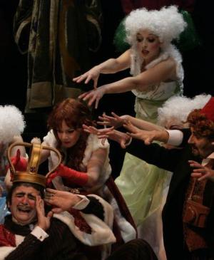 Est-ce l'atmosphère détendue d'un festival à taille humaine ? Est-ce l'ambiance estivale ? La beauté de la région ? Un plus grand intimisme du Théâtre de l'Usine par rapport au Sylvia Monfort ? Toujours est-il que le spectacle nous a plus séduit en ces lieux que par le passé… Côté orchestre, les choses sont plus au point. Les approximations entendues à Paris ou Dijon font place à Saint-Céré à beaucoup plus d'assurance. La justesse est de mise, la cohésion évidente. L'urgence théâtrale semble également plus nette en ces lieux et l'on évite les temps morts. Côté chanteurs, la succession des représentations a permis un bon rodage. Oublions la médiocrité de certaines voix féminines pour nous délecter de la drôlerie de l'ouvrage. Et encore il faut souligner qu'Agnès Bove s'est nettement améliorée et que Cécile Limal est toujours aussi délicieuse. Les messieurs quant à eux se partagent entre acteurs chantants (Roi Carotte, Prince Fridolin) – mais avec quelle efficacité comique ! – et véritable chanteurs lyriques très en voix (Pipertrunck, Quiribi). La mise en scène est d'un comique décalé, joue beaucoup sur les mimiques (et pour cela dispose d'interprètes idéaux !) et d'innombrables références à l'actualité politique. Mais il est vrai que l'ouvrage était un brûlot contre Napoléon III et réclame donc ce type de comique. Pour le reste, il est impossible de citer toutes les trouvailles comiques d'Olivier Desbordes, bornons-nous à signaler qu'elles fonctionnent sur le public ! Le décor est fait de deux niveaux et les musiciens sont nichés sous le plateau le plus haut. Le dispositif permet de nombreuses combinaisons grâce à quelques modifications à vue. L'acte de Pompéi – car nos héros voyagent dans le temps à la recherche de l'anneau de Salomon – est ainsi particulièrement réussi ainsi que la scène des barricades à la fin. Les héros soulignent que rien n'a changé entre l'Antiquité et leur époque, la mise en scène souligne qu'en politique, rien n'aurait non plus changé entre le royaume d'opérette de Fridolin XXIV et notre époque, et si l'on en croit Robin Luron : «Il n'est pas possible de gouverner plus mal»…