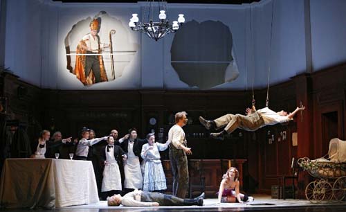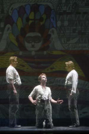 Berne. Stadttheater. 19-IX-2008. Per Nørgård (né en 1932) : Der göttliche Tivoli, opéra en 2 actes d’après des textes d’Adolf Wölfi. Mise en scène : Sandra Leupold. Décors et costumes : Barbara Rückert. Vidéo : Per Englebracht, Stephan Komitsch. Dramaturgie : Katharina Kost. Avec : Andrea Stadel, Bianka / Lidia / Wildermuth / Margritt / Santta Maria ; Fabienne Jost, Mutti / Mathilde / Heilige Mutter ; Daniel Szeili, Doufi / Orpheus ; Hubert Wild, Adolf Wölfi / un nègre ; Steffen Kubach, Sankt Adolf II ; Bernd Gebhardt, Sankt Adolf / Doktor ; Jianeng Lu, Tadahiro Masujima, Simone Tschöke, Sandra Rohrbach, les oiseaux. Hans-Kristian Sørensen, percussions solo. Franz Rüfli, Daniel Scheidegger, Ferdinand Heidiger, Oliver Schär, Adrian Schild, percussions. Matthias Kuhn, violoncelle. Genova Dessislava, synthétiseur. Direction musicale : Dorian Keilhack.