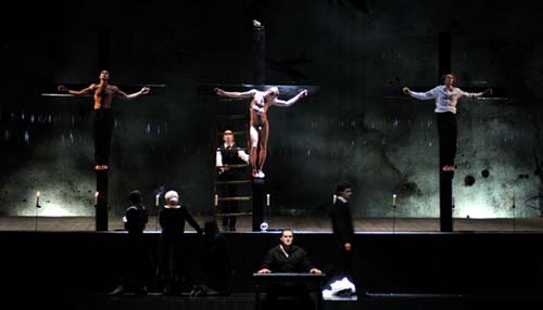 Un revirement à attribuer d'abord à la direction dynamique d'un particulièrement inspiré. On sait le chef américain à l'aise avec la musique de Berlioz. Survoltant l', sa direction franche impose un rythme qui resserre cette suite de tableaux dans ses images scéniques essentielles. Surprenant parfois ses troupes, s'aventure dans des tempos qui génèrent quelques décalages entre la masse des chœurs et l'orchestre. D'autre part, en supprimant quelques images sans grande portée ou en insérant d'autres scènes de 2003 dans le contexte musical au lieu de les montrer en dehors du jeu orchestral, contribue avantageusement à l'allègement de son propos scénique. Ainsi, la très choquante scène de crucifixion du spectacle précédent semble plus «acceptable» parce qu'enchâssée dans le discours musical. Il n'en reste pas moins qu'à son habitude, se complait dans les clichés coutumiers à son imagerie scénique : grands murs de planches noires, rideaux de plastiques gris éclairés en transparences, danseurs nus armés d'ailes de carton sans oublier quelques inutiles échelles, l'accessoire traditionnel indispensable à toutes mises en scène branchées. Tout en se questionnant sur la signification profonde de montrer un chœur d'hommes vêtus de tutus blancs ou celui de ce tour de scène d'un tank porté à bout de bras par une douzaine d'éphèbes, on cède à la folle musique de Berlioz qui survole bienheureusement l'univers d'Olivier Py.