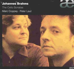 Johannes Brahms (1833-1897) : Sonate pour violoncelle et piano n°1en mi mineur op. 38 ; Sonate pour violoncelle et piano n°2 en fa majeur op. 99  ; Sonate pour violon n°1 en sol majeur op. 78 (arrangée pour violoncelle et piano). Marc Coppey, violoncelle ; Peter Laul, piano. 1 CD Aeon AECD 0867. Code barre : 3 760058 368671. Enregistré en septembre 2007. Notice bilingue (anglais, français ; notice courte). Durée : 78’42’’.