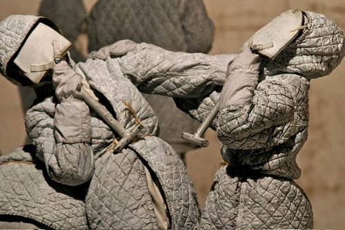 De dos, de profil ou de trois-quarts, les interprètes tiennent soigneusement une pelle masquant entièrement leur visage. Régine Chopinot avait déjà masqué visages et corps dans ses spectacles des années 1990, comme le célèbre St Georges. Depuis, d'autres chorégraphes, de Boris Charmatz à Christian Rizzo, en passant par Philippe Quesne ou Gisèle Vienne, pratiquent volontiers la dissimulation de leurs interprètes sous des pièces de vêtement. Dans une atmosphère d'outre-tombe, ce parti pris projette le spectateur vers un futur déprimant. Une fin du monde aux allures guerrières où des silhouettes anonymes, dépersonnalisées, errent dans la poussière.