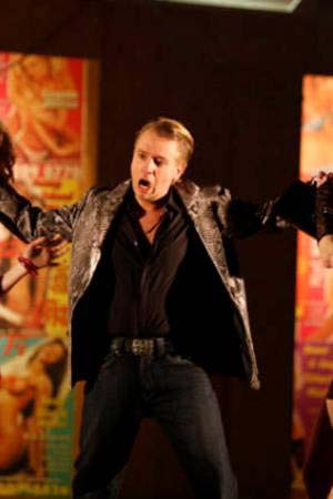 Les personnages sont plus caricaturés que caractérisés, la fameuse scène de billard n'en est pas une et le pauvre baryton doit chanter son grand air en revenant d'un bordel, deux prostituées dans les bras. Sans parler de l'idée vraiment fâcheuse de préenregistrer la plupart des dialogues dans un style de cinéma années 30 difficilement compréhensible dans la salle. Est-ce la qualité de l'enregistrement, celle des hautparleurs ou est-ce même voulu que l'on a autant de mal à suivre le texte ?
