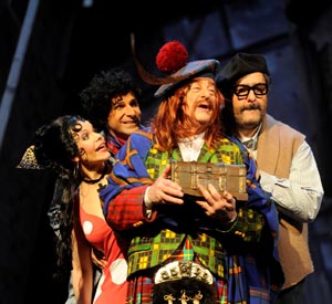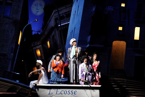 Mettre en scène cette avalanche de péripéties est une véritable gageure. Carlos Wagner opte raisonnablement pour un décor unique, la cour d'immeuble madrilène qui sert de point de départ à l'intrigue. Tout s'y déroulera dans l'imaginaire des protagonistes. L'idée n'est pas neuve mais sa mise en œuvre est d'une créativité foisonnante. La cour est très réaliste, avec loge de concierge et lavomatic au rez-de-chaussée mais les bâtiments sont de guingois, tout comme le sol qui figure un grand livre ouvert. Le bateau est une baignoire, le condor une pelle mécanique et le tremblement de terre est occasionné par un marteau-piqueur. La scène sous-marine, parodie du Trésor de Rackham le Rouge mâtinée de ballet aquatique à la Esther Williams, est délicieuse. Quand s'y ajoutent les costumes délirants et les hautes perruques concoctés par le talent de Patrick Dutertre, on est clairement chez Pedro Almodovar en pleine «Movida» (coup de chapeau aux artisans des ateliers de l'Opéra de Lorraine qui ont habilement confectionné les trois cents costumes de cette production). L'imagination est au pouvoir et l'on rit souvent des gags inventifs comme quand le tableau au Chili est symbolisé par un énorme piment ou que les cannibales maoris entament un «Haka» endiablé. Bien sûr, tout n'est pas d'un niveau constant et l'on peut trouver par moments que le rythme s'étiole, que les dialogues (en français et bourrés de calembours) sont un peu longuets, l'action confuse ou la fin trop abrupte. Mais sur l'ensemble du spectacle, cette mise en scène est un régal et une franche réussite.