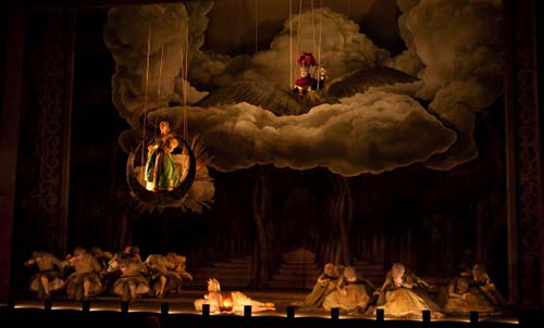 Peu de lumière à la manière de bougies mais une lumière d'or évoquant la nuit ou le coucher du soleil. Mais c'est le soleil noir des enfers qui est peut-être le plus extraordinaire. Les chorégraphies, si importantes, sont variées et d'une rare élégance. La richesse et l'ampleur des costumes sont telles que la vaste scène est rapidement habitée. Les décors en toiles peintes avec effets de perspectives sont sidérants d'efficacité dramatique et les changements de décors à vue ajoutent à la magie du spectacle. Le jeu des acteurs est stylisé et naturel à la fois, en un parti pris d'élégance de tous les instants. Peu de couleurs mais distribuées avec goût : or et crème pour Hippolyte et Aricie, rouge pour Thésée et Phèdre, vert d'eau pour les chœurs et or cuivré pour l'Amour et sa cour.