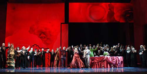 Liège. Théâtre Royal. 12-III-2009. Giuseppe Verdi (1813-1901) : La Traviata, opéra en 3 actes sur un livret de Francesco Maria Piave. Mise en scène : Stefano Mazzonis Di Pralafera ; décors : Edoardo Sanchi ; costumes : Kaat Tilley ; éclairages : Franco Marri. Avec : Ekaterina Sadovnikova, Violetta Valéry ; Antonio Gandia, Alfredo Germont ; Alberto Rinaldi, Giorgio Germont ; Tineke Van Ingegelm, Floria Bervoix ; Federica Carnevale, Annina ; Cristiano Cremonini, Gastone Letorière ; Chris De Moor, Barone Douphol ; Patrick Delcour, Marchese d’Obigny ; Lorenzo Muzzi, Dottore Grenvil ; Marcel Arpots, Giuseppe. Orchestre et chœurs de l’Opera Royal de Wallonie (chef de chœur : Marcel Seminara), direction : Paolo Arrivabeni.