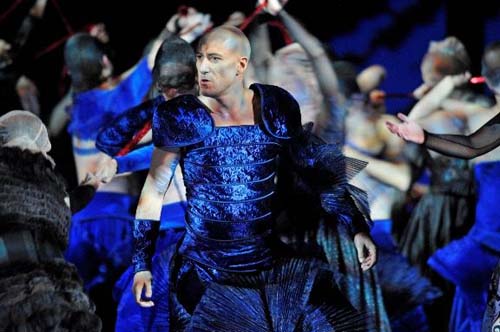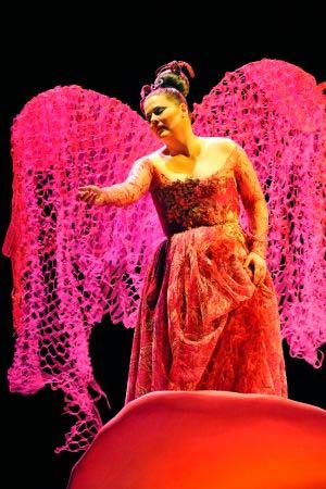 Mettre en scène un tel scénario n'est certes pas aisé. Fallait-il pour autant proposer ce mélange de manga japonais, Cirque Barnum, Priscilla folle du désert, La cage aux folles et Angels in America passé au prisme d'une revue du Lido ? Lumières roses, fumée, ailes d'ange, strass, tenues dénudées (surtout pour ces messieurs) et uniformes japonisants pour les guerriers terrestres peuplent la scène, tant bien que mal, tant la direction d'acteur est déficiente. Côté décors et accessoires, un véritable catalogue de jouets pour Noël : poupées Barbie, lego géant, boîtes magiques et fleur gigantesque. Du rose, du rose et encore du rose, jusqu'à l'écœurement, écœurement que le public a manifesté aux saluts finaux.
