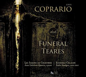 John Coprario (v. 1575 – 1626) : Songs of Mournings ; The masques of Squires ; Funeral Teares. Anne Delafosse – Quentin, Soprano. Paulin Büngden, Contre – Ténor. Rémi Cassaigne, luth. Angélique Mauillon, harpe. Florence Bolton, Eleonor Lewis – Cloué et Luc Gaugler, viole de gambe. Les jardins de Courtoisie et l’Ensemble Céladon. 1 CD Zig Zag Territoires ZZT090302. Code barre : 3 76009 29180. Enregistrement à L’Eglise évangélique allemande à Paris 9° du 9 au 13 juin 2008. Notice en français et en anglais. Durée : 60’35’’