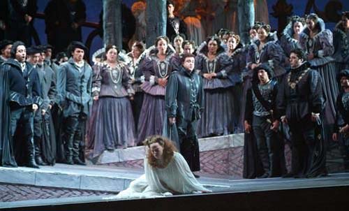 Et de fait ce fut peut-être la plus belle soirée de la saison toulonnaise. Très vite on pouvait apprécier la cohésion de l'orchestre, formant une belle pâte homogène, malgré le solo de cor d'ouverture très en dehors et cuivré. Gros bémol à cette homogénéité les constants décalages entre l'orchestre et les chœurs, défaut récurrent dans les directions de Giuliano Carella qui a tendance à s'emballer lors des tutti et surtout à diriger beaucoup plus la scène que la fosse, ce dont les choristes et les chanteurs lui savent généralement gré. Emporté dans sa direction passionnée, le chef italien oublie le tempo et l'orchestre, et peut-être même les chanteurs eux-mêmes, puisqu'on l'entend chanter certaines parties d'orchestre et… de solistes ; passe pour le ténor, mais pour la soprano, c'est déjà plus délicat. En dépit de ces défauts importants et récurrents, l'interprétation venait rehausser des décors et des costumes imposants et somptueux – peut-être trop pour des «puritains» – notamment pour les costumes de femmes. Les tableaux d'époque les révèlent en effet plus sobres, ainsi qu'il sied à l'esprit #«puritain» des partisans de Cromwell. Mais sans doute ces costumes entendaient-ils renforcer la mise en scène relativement statique, faite d'imposants tableaux qui, pour tromper cette relative immobilité, se devaient de rompre avec la sobriété. Sobriété que rappelaient toutefois les décors d'une austère beauté. L'un des tableaux les plus réussis, tant du point de vue scénique que musical, fut peut-être l'entrée triomphale de Talbot, malgré des percussions un peu en dehors.