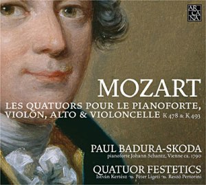 Wolfgang Amadeus Mozart (1756-1791) : Quatuors pour le pianoforte, violon, alto et violoncelle K. 478 en sol majeur ; K. 493 en mi bémol majeur. Paul Badura-Skoda, pianoforte Johann Schantz (ca. 1790) ; István Kertész, violon école milanaise (XVIIIe siècle) ; Péter Ligeti, alto Matthias Albanus (1651) ; Rezsö Pertorini, violoncelle anonyme français (XVIIe siècle). 1 CD Arcana A350. Code barre 8 033891 690144. Enregistré à Vienne, Zögernitz Casino, du 23 au 25 janvier 1993. Notice quadrilingue (français, anglais, italien et allemand). Durée totale : 59’15’’
