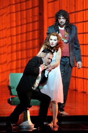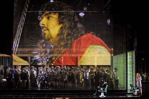 Pourtant, cette mise en scène iconoclaste, malgré la lassitude engendrée par les projections vidéo en direct, marotte actuelle de tout dispositif scénique, est d'une rare intelligence. Roger ne règne pas sur Palerme (le livret traite de l'épisode historique du royaume Normand de Sicile) mais est le chef de file, homme brutal, parvenu nouveau riche et «bling-bling» d'une société bourgeoise et conservatrice. Une allusion à peine masquée à un personnage politique officiel actuel, sauf que son épouse Roxana a bien plus de décibels dans la voix. Le médecin arabe Idrisi est devenu un conseiller personnel cynique, et le Berger, Dionysos qui trouble cet ordre apollinien, un baba cool androgyne post-soixanthuitard. Si Roxana, fidèlement au livret, est conquise d'emblée, la douce extase finale du Roi Roger, homme du nord découvrant la lascivité méditerranéenne, n'est plus. Nous assistons impuissants à sa déchéance : abandonné par Roxana, mal conseillé par Edrisi, Roger est une épave humaine héroïnomane dont la dernière vision est une hallucination mesquine de cette société de loisirs et de consommation qu'il a toujours voulu vanter.