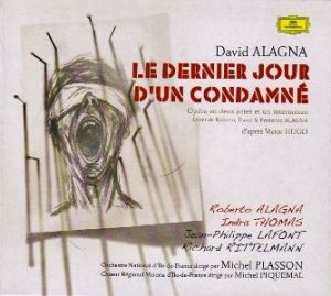 David Alagna (1973) : Le Dernier Jour d’un Condamné. Roberto Alagna, Le Condamné ; Indra Thomas, La Condamnée ; Jean-Philippe Lafont, Le Geôlier / Le Directeur / Le Prêtre / L’Huissier de Justice / L’Aumônier / Le Bourreau ; Richard Rittelmann, Le Guichetier / Un Friauche / Le Procureur Général. Orchestre National d’Île-de-France, Chœur Régional Vittoria d’Île-de-France (Chef de chœur : Michel Piquemal) Direction musicale : Michel Plasson. 2 CD Deutsche Grammophon DGG 480 095 8. Code barre 0 28948 00958 9. Enregistré live en juillet 2007 au Théâtre des Champs-Elysées, Paris. Notice de présentation en français, anglais et espagnol. Livret en français. Durée : 1h42’35’’