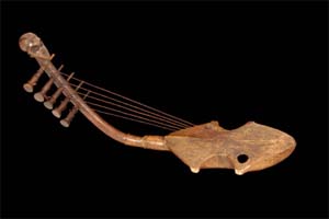Prenons un exemple : imaginons notre homme préhistorique en train de faire sécher une peau d’animal. Pour tendre celle-ci, il la fixe sur un cadre. Et, pour une raison ou pour une autre, il pose son ouvrage sur une calebasse et racle la peau. Vous l’aurez compris, cela produit un son remarquable. Mais il existe une grande différence entre ce phénomène et celui de l’arbre creux dont nous parlions plus haut. Si ce dernier produit un son plus fort et plus résonnant que le même arbre plein, c’est quand même le même son d’un arbre que l’on tape que l’on entend. Tandis que, dans le cas de la peau tendue, le son produit n’a rien à voir avec l’objet. Il existe là, non plus une simple différence de degré, mais bien de nature, entre le son de la peau de l’animal mort et celui vivant. Pour autant, l’origine de ce son est bien liée à l’animal, en tout cas à un morceau de lui. L’homme va donc «logiquement» considérer que cet animal continue à se manifester, en l’occurrence par le son, au delà de sa mort, ce qui suppose un pouvoir particulier, terrible et fascinant. Terrible, parce que cet animal, il a bien fallu le tuer, ce qui sous-entend une certaine violence. On est en droit de redouter une vengeance de sa part. Et fascinant, parce que, encore une fois, ce phénomène est «contre-nature», et le signe d’une puissance qui dépasse celle de l’humain. Aussi, en signe de respect, et pour profiter au mieux de la puissance de cet esprit, il est préférable de conserver sa peau dans son intégralité et de tailler une coque qui, à la différence de la calebasse ronde, conservera le contour de cette peau. Si l’on rajoute un manche fait avec une corne du même animal, ou en bois, mais ressemblant à cette corne et que l’on tend des cordes en boyaux dessus, on obtient cette harpe africaine dont la forme est exactement celle de notre violon occidental, bien que son mode de jeu soit complètement différent. (Voir photo).