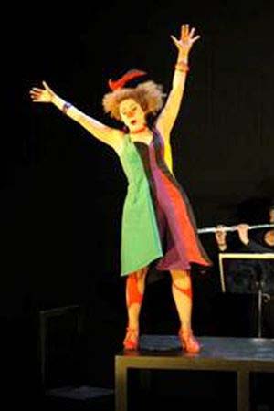 Œuvre de jeunesse (1927) d'une douzaine de minutes, Hin und Zurück s'inscrit dans le mouvement artistique nommé Neue Sachlichkeit (Nouvelle objectivité) né en réaction contre l'expressionnisme. La trame narrative (traduit en français par Lionel Peintre) tient ici du drame domestique : un scénario catastrophe réduit à sa plus simple expression. Un mari jaloux – leste Nicolas Gambotti – tue sa femme – truculente Nathalie Gaudefroy – lorsqu'elle lui avoue avoir un amant et se jette ensuite par la fenêtre ; apparaît alors un «sage» – impressionnant Christophe Crapez – qui fait rejouer la scène à l'envers : un «rembobinage» effectué sous nos yeux, dans le temps vécu d'une rétrogradation : «Ma fin est mon commencement» aurait dit Guillaume de Machaut en son temps ! Avec leur nez rouge et leurs gestes d'automate, les six personnages jouent ce «sketch avec musique» sur le mode de la farce de cirque, tel un tour de passe-passe minutieusement réglé par «l'illusionniste» et superbement enlevé par la troupe des comédiens/chanteurs et des sept instrumentistes de l'Orchestre imaginaire qui, installés côté cour, échappent à nos regards.