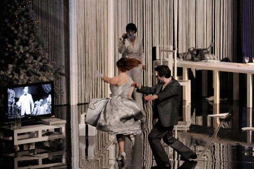 S'enchaînant sans pause, Le long dîner de Noël induit, comme son titre le laisse présumer, une temporalité toute autre. C'est la dernière œuvre lyrique d'Hindemith que Lionel Peintre traduit en français et transcrit pour ces mêmes instrumentistes. Il s'agit de condenser en moins d'une heure l'histoire des 90 années d'une famille américaine dont les générations se succèdent autour d'une table dressée pour le repas de Noël. Les personnages semblent tous prisonniers de ce processus cyclique auquel chacun se soumet (sauf le fils rebelle), réitérant les mêmes gestes (couper la dinde) en un rituel vide de sens : le temps file et les images défilent sur les écrans d'un téléviseur, creusant la perspective temporelle ; les êtres passent (onze personnages pris dans cette spirale du temps) et les banalités s'espacent, le mouvement se figeant progressivement dans un silence inquiétant. Tout comme les images, l'écriture musicale, complexe et exigeante, d'Hindemith, balançant entre lyrisme et atonalisme libre, donne du relief à ce ballet de l'absurde, ménageant des décrochements temporels très expressifs ; ainsi ces plages chorales très suspensives (Christmas Carol), redonnant ponctuellement un sens à la voix collective. A la tête de l'Orchestre imaginaire, Fabrice Kastel assume avec brio la complexité d'une telle partition tandis que les huit chanteurs, – qu'accompagne le personnage muet de la nurse / Francesca Bonato – formant un plateau très homogène, accomplissent leur destin, traçant sous nos yeux cet itinéraire de l'échec.