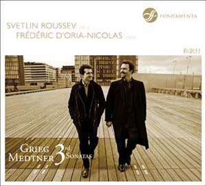 Bien que la Sonate n°3 de Medtner date de 1939, son romantisme ne semble pas attardé, et atteint au grandiose par des dimensions «épiques» (près de quarante minutes) et par un langage d'une complexité toute personnelle. L'introduction, d'une beauté hiératique, conduit à un Allegro foisonnant, où se révèle l'art du compositeur : les thèmes, typiquement russes, se succèdent sans transition, les repos harmoniques et les ponctuations naturelles sont le plus souvent évités. Il en résulte un discours puissant et tendu comme la strette d'une fugue (le moment proche de la fin où toutes les voix entrent de manière rapprochée). On imagine la concentration épuisante qu'un tel langage impose aux exécutants : Svetlin Roussev et Frédéric D'Oria-Nicolas s'en tirent avec encore plus de cohésion et de raffinement que dans Grieg. Ils font aussi montre d'un superbe lyrisme dans le troisième mouvement, qui, curieusement, revient à un langage beaucoup plus proche de Brahms. Autre moment étonnant et révélateur : dans le Scherzo, le rythme issu du second thème se transforme brusquement en une habanera qui dure moins d'une minute avant le retour du torrent contrapuntique. C'est dire que Medtner ne recherche ni l'intériorité de Brahms, ni la sensualité de Rachmaninov, et que le mélomane en sera peut-être décontenancé. L'œuvre mérite pourtant d'être apprivoisée. Même si l'on peut rêver des enregistrements par David Oïstrakh et Alexander Goldenweiser (indisponible) ou par Vadim Repin et Boris Berezovsky (disponible uniquement dans un coffret de 10 CD consacré au violoniste chez Warner Classics), voici un disque à tous égards précieux.