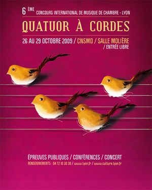 Concours International de Musique de chambre de Lyon. 6ème année. Session quatuor à cordes. Lyon, du 26 au 29 octobre 2009. Directeur général : Joël Nicod. 26 octobre : épreuves éliminatoires au CNSMD de Lyon ; 28 octobre : demi-finale Salle Molière ; 29 octobre : finale, même lieu et concert des lauréats à 20h30 présenté par Frédéric Lodéon.