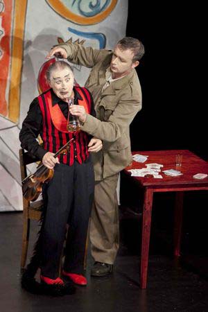 Sur la scène, vêtu de quelques costumes trouvés au hasard des ateliers du théâtre, chacun mime son personnage. Sous ses allures martiales malgré sa démarche paysanne, le Soldat (Kai Leclerc) est le parfait ingénu. Le Diable transformé en gentleman, peine à cacher sa queue sous ses habits. Il s'ingénie à la perte de l'âme du soldat. Les images défilent sans accrocs, constellées de petites touches se rapportant aux métiers du cirque dont Dimitri est un chantre. On joue le violon en le plaçant sur la tête, on exécute quelques culbutes, on esquisse quelques tours de jonglerie. Un spectacle admirable de finesse, de professionnalisme et de poésie. Sur les côtés du tréteau, les sept solistes de la partition ponctuent les dialogues et le discours de ses courtes interventions composées par Igor Stravinski.