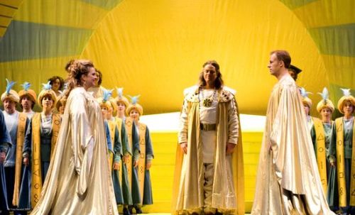 En adéquation avec la scénographie, David Hockney, le concepteur des costumes et des décors, nous replonge dans le conte populaire, – le dragon qui crache la fumée, les animaux qui dansent, une licorne qui se gambade sur scène – nous entraîne dans l'antre lunaire, sombre, – le rocher qui se fend pour voir apparaître la Reine la nuit – et la vue solaire sur le temple de Sarastro. Le tout, dans les éclairages bleutés, souvent chatoyants d'Anne-Catherine Simard-Deraspe qui culminent à la lumière vive de l'esprit. C'est une approche toute en reliefs, du haut des airs, cartographiée et colorée mais qui n'exclut en rien la profondeur du propos, ni la pensée humaniste. Et cela semble s'accorder à la conception aérienne du chef d'orchestre. Il n'appuie pas. C'est en nacelle, à l'instar des Trois Garçons, qu'Alain Trudel survole la topographie de l'œuvre, évitant les aspérités trop crues, toujours porté par une brise bienveillante sous un ciel radieux. Nous défions quiconque de bouder son plaisir devant un tel spectacle. Aucun accident de parcours à signaler et qui viendrait perturber cette marche vers la lumière.