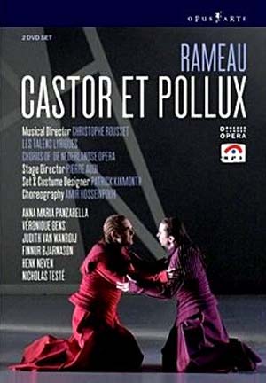 Après la publication de Zoroastre, filmé au Théâtre de Drottningholm, voici Castor et Pollux (version de 1754), donné début 2008 par la même équipe, qui a dû adapter son esthétique à l'immensité du Muziektheater d'Amsterdam.