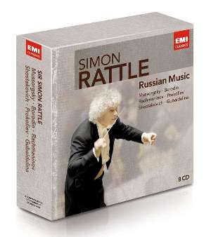 Modest Moussorgski (1839-1881) : Tableaux d'une exposition (orchestration de Maurice Ravel) ; Alexandre Borodine (1833-1887) : symphonie n°2 en mi mineur, Danses polovtsiennes du Roi Igor ; Serge Rachmaninov (1873-1943) : symphonie n°2 en si mineur, Op. 27 ; Vocalise, Op. 34 ; concerto pour piano n°2 en ut mineur, Op. 18 ; Rhapsodie sur un thème de Paganini, Op. 43 ; Danses symphoniques, Op. 45 ; Dimitri Chostakovitch (1891-1953) : symphonies n°1 en fa mineur, Op. 10 ; symphonie n°4 en ut mineur, Op. 43 ; symphonie n°10 en mi mineur, Op. 93 ; symphonie n°14, Op. 135. Serge Prokofiev (1891-1953) : symphonie n°5 en si majeur, Op. 100 ; Suite Scythe, Op. 20, concerto pour piano n°1 en ré majeur, Op. 10 ; Sofia Gubaidulina (née en 1931) : Zeigestalten. Cécile Ousset et Andrei Gavrilov, piano ; Karita Mattila, soprano ; Thomas Quasthoff, baryton. Berliner Philharmoniker, City of Birmingham Symphony Orchestra, Los Angeles Philharmonic Orchestra, London Symphony Orchestra, Philharmonia Orchestra, direction : Sir Simon Rattle. 1 coffret de 8 CD EMI. Référence et code barre : 50999 6 97597 2. Enregistré entre 1977 et 2007. Notice de présentation en : anglais, allemand et français. Durée : 8h16
